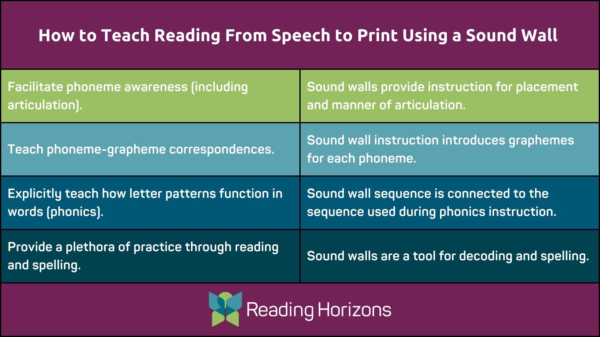 A lot goes into how people learn to read and how educators teach people to read. Teaching phonemic awareness among young and striving readers is a necessary first step, as learning to read moves from speech to print. Educators need to facilitate an awareness of speech sounds, then teach phoneme (sound) to grapheme (letters) correspondence and explicitly teach how those letter patterns function in words. At Reading Horizons, we directly instruct each phoneme and its corresponding grapheme as the foundation for phonics instruction. A key tool for teaching phonemes and their corresponding graphemes is a sound wall. Sound walls show the articulatory gestures of each letter sound in the English language and the letter or letters representing those sounds to create easy-to-implement instructions aligned with how a brain learns to read.