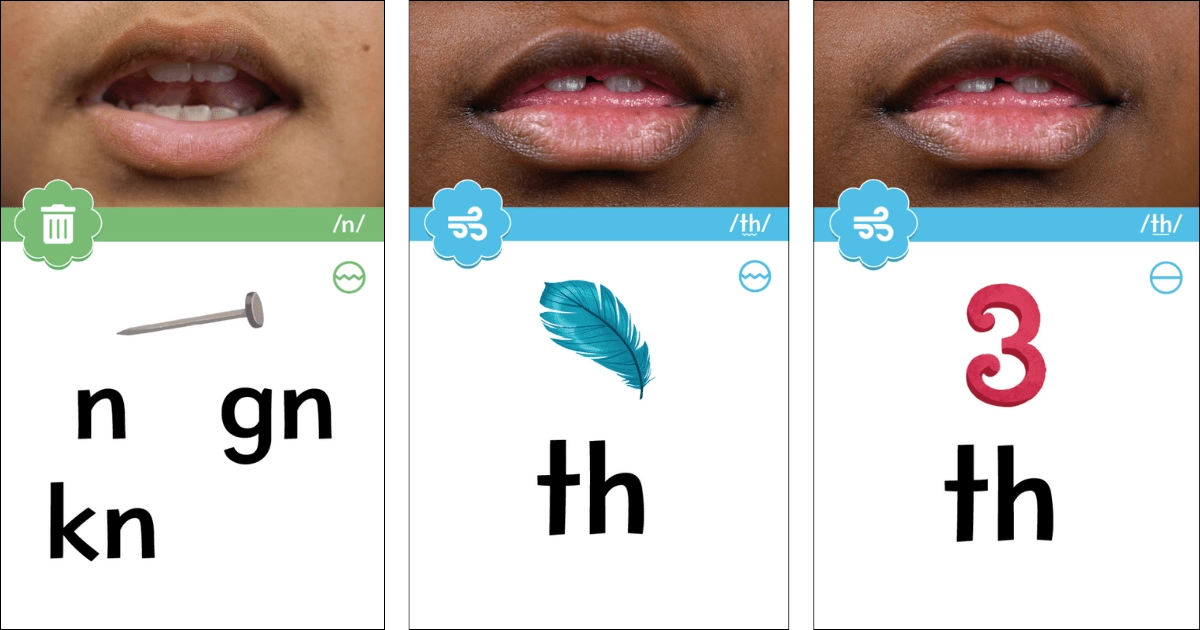Examples of word wall sound cards for the /n/ sound, the voiced /th/ sound, like in the word the or feather, and unvoiced /th/ sound like in the word three.