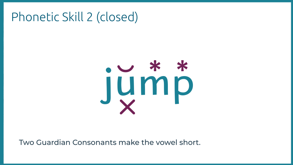 A vowel followed by two consonant sounds = short vowel sound. (Think jump.)